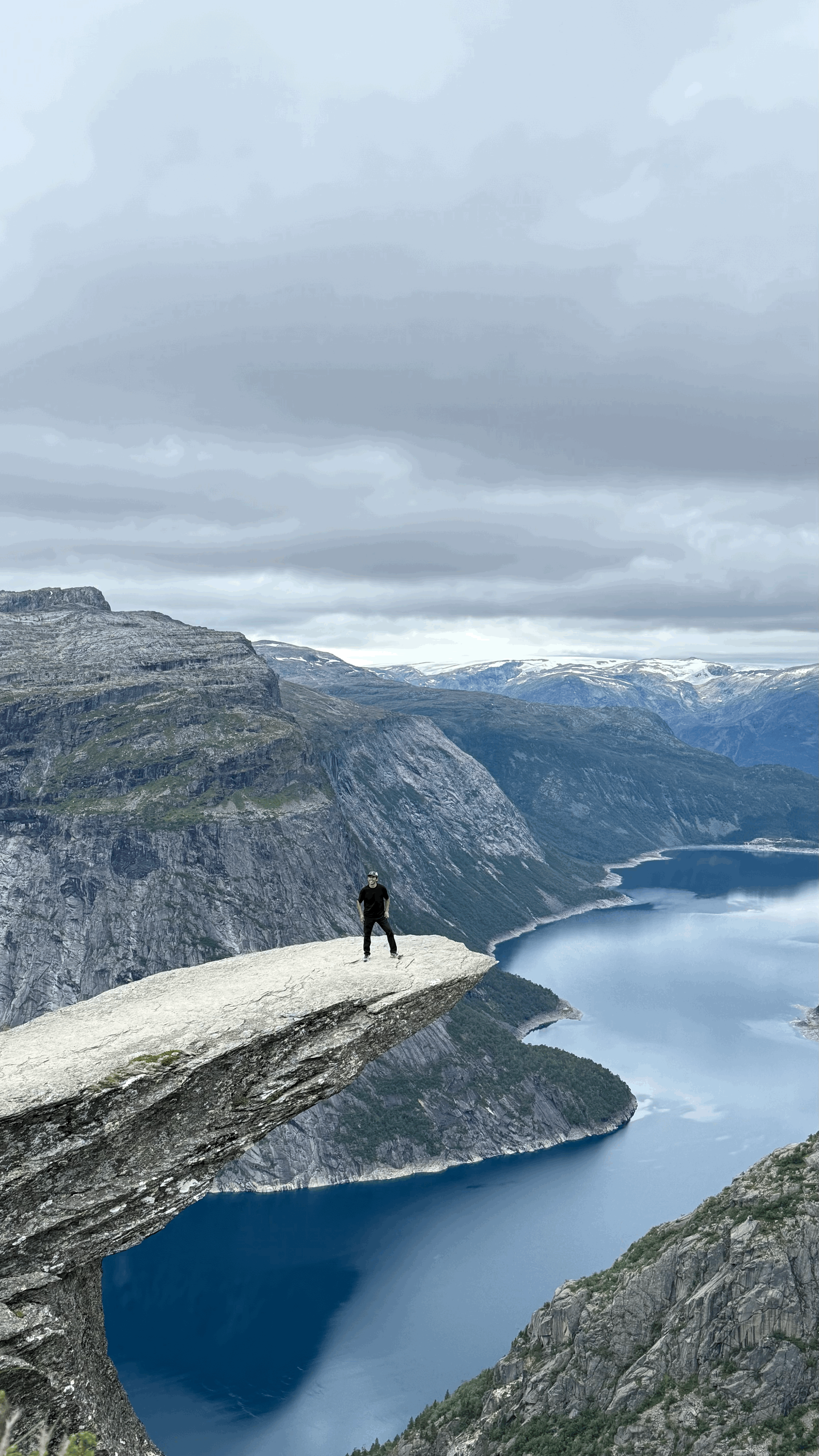 Смотровая площадка с панорамным видом на долину и горы. Прозрачная платформа создаёт ощущение полёта и позволяет увидеть масштаб норвежской природы с высоты.